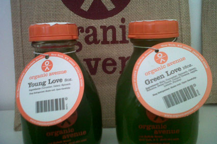 Modelos, estilistas, fashionistas e quem é antenado em NY conhece o Organic Avenue, bar de sucos e comida natural. O suco Mellow Love é um antioxidante que incluiu pepino, aipo, alface, espinafre, salsa e sal do Himalaia e ao lado são uma garrafa de elixir com toque de gengibre - e outro de elixir de clorofila. Os sucos são ecologicamente sustentáveis, pois as garrafas de vidro robusto retornáveis após o uso valem desconto quando devolvidas para reencher.