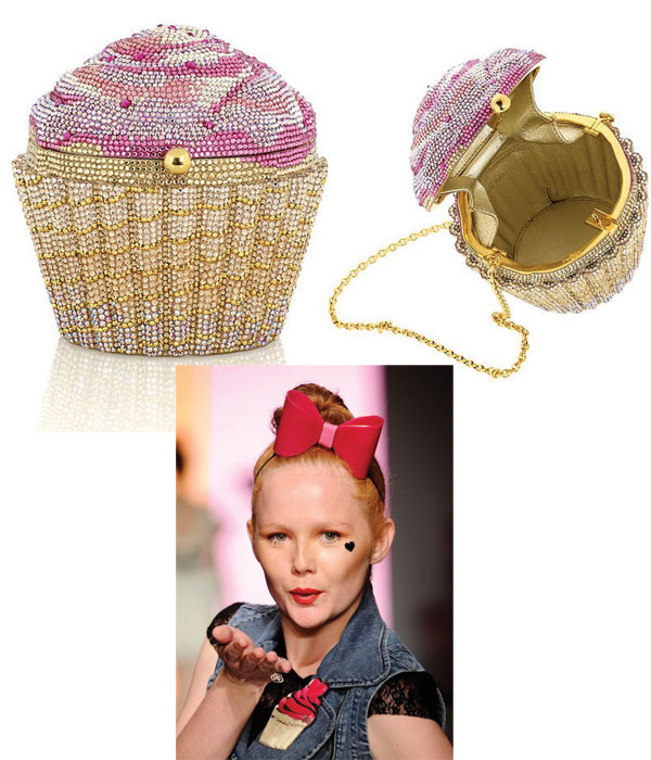 Os cupcakes, típico bolinho inglês, com cobertura colorida e decoração chamativa, que é moda nas festas invadiu o guarda-roupa. Ele dá forma aos acessórios da grife mineira Chouchou e nas luxuosas bolsas em cristal da designer húngara Judith Leiber, uma das favorita das estrelas internacionais.