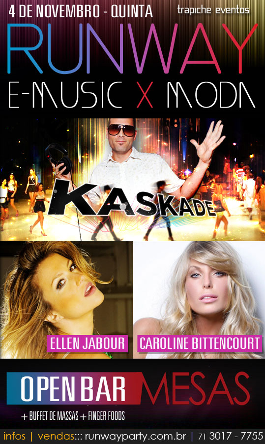 A Runway Party irá inovar em termos de conceito de festa, pois vai reunir moda e música eletrônica numa festa open bar, no Trapiche Eventos, sexta, dia 04/11. A balada vai contar com o DJ Kaskade, que além de ser a sensação do momento, é um gato. O evento ainda apresentará um desfile de moda protagonizado pelas TOPs internacionais Caroline Bittencourt e Ellen Jabour.