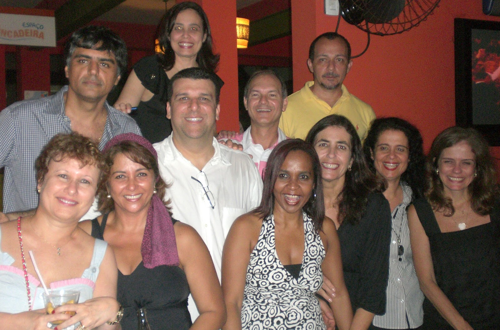 | Kitty, Giovana, Antonia, Karina, Kátia e Silvana,(embaixo) Adolfo, Jussara, Mazzoni, Edgar e João (no alto) no encontro de colegas do Maristas |