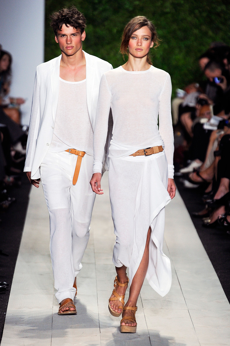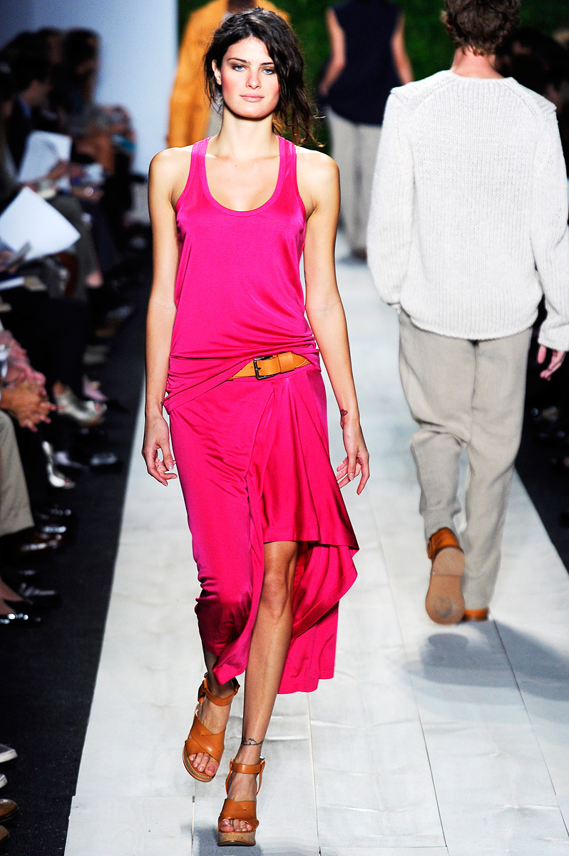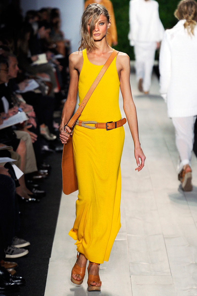 Vestidões, saias e mini-vestidos, nas cores quentes ou em tons nude, em tecidos leves, tecnológicos, e também nas malhas frias, invadem a passarela na coleção Primavera Verão de Michael Kors.