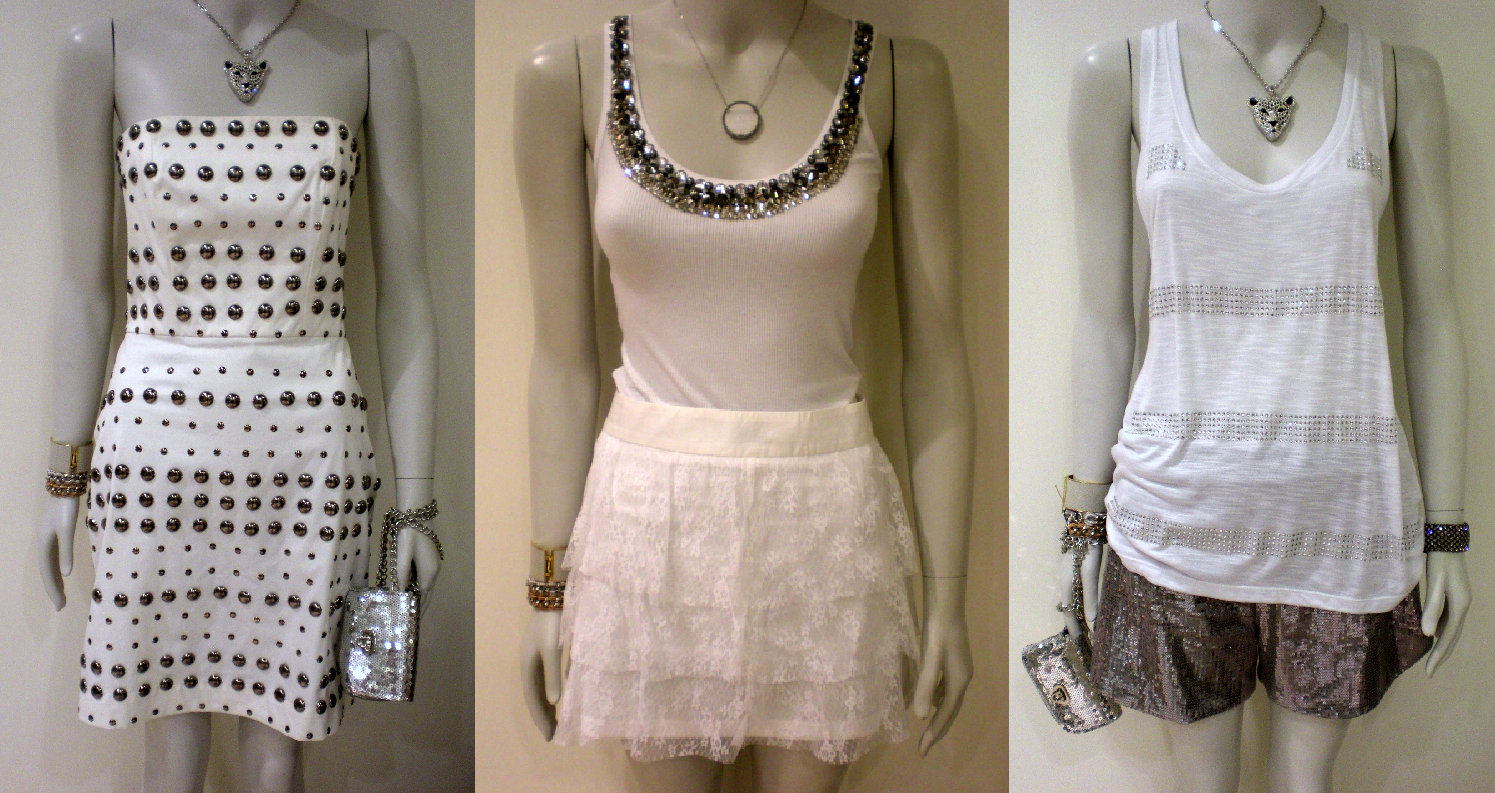 1-Short R$460, blusa R$580, cinto R$490 e bolsa R$990 tudo Daslu / 2-Vestido longo seda Daslu R$1.860/ 3-Vestido lurex branco 284 R$199, bolsa paéte ouro e prata R$ 299. Tudo na Su Misura. Acessórios: pulseiras, colares, pingentes: Rafael Falcci e Gabriela Aydar na Su Misura (sob consulta).