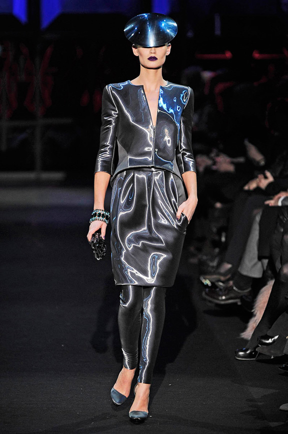 Basicamente, este espectáculo é composto por um coleção futurista toda brilhante da Armani. As jaquetas e os vestidos de noite retos levam essencialmente as mesmas formas como era de se esperar, mas Armani Privé brincou com alguns tecidos muito interessantes. O único problema é que, se você não amar o brilho, não há nada para você nesta coleção.