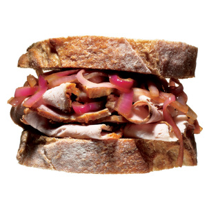 Refogue as fatias de cebola roxa em azeite até ficarem macias, adicionando um pouco de vinagre de vinho tinto enquanto elas cozinham. Monte no pão de massa fermentada (tipo Ciabata ou italiano) as camadas com as fatias de carne de porco assada fina e em cima da carne de porco o relish de cebola. Adicione um pouco de Ketchup, se quiser.
