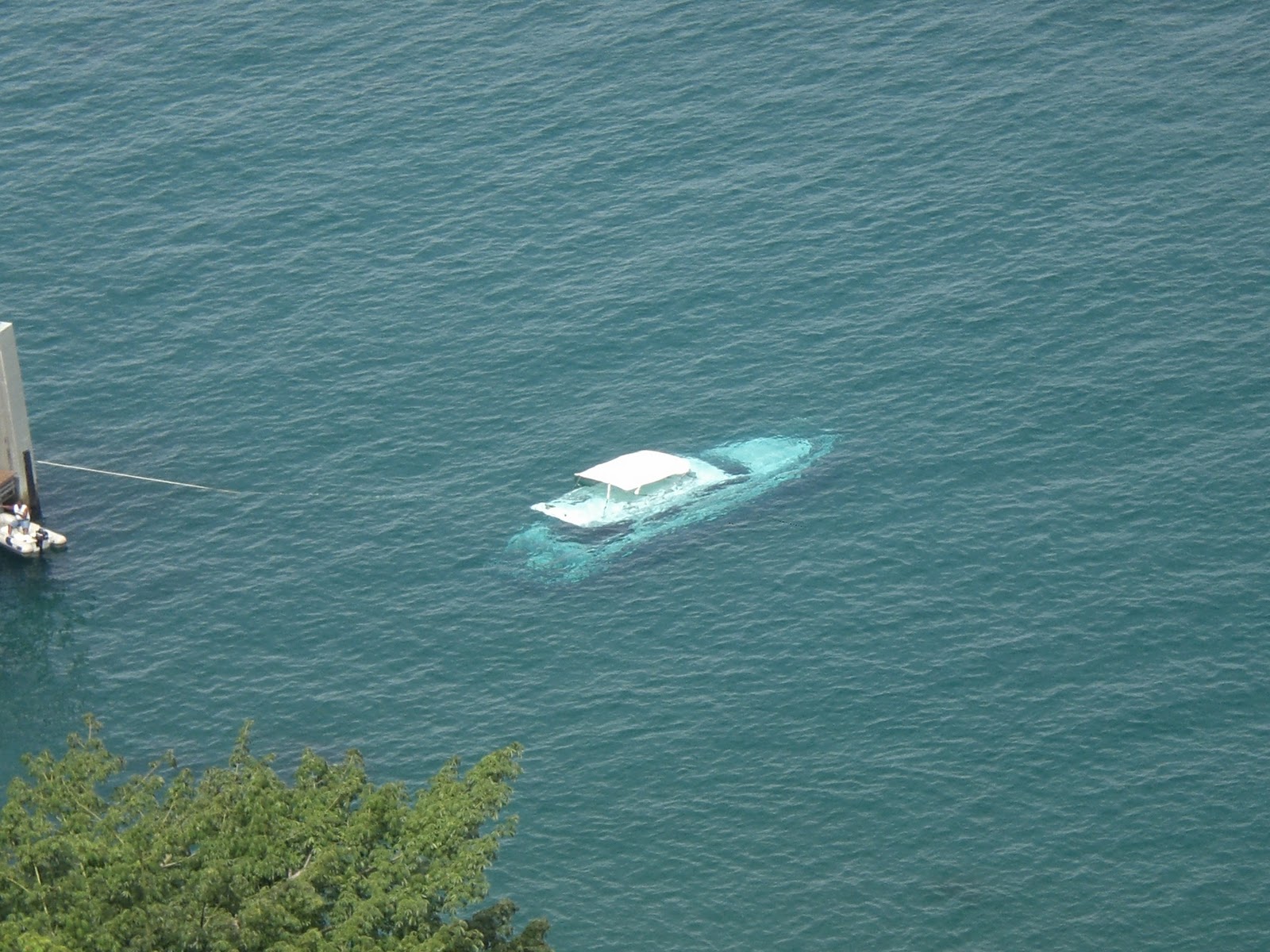 Deu para ver de manhã a lancha abaixo afundando. Segundo o marinheiro Vado de outra lancha, "Sumier", que conhece o marinheiro da lancha afundada, voltando da festa do Yatch Day ele bateu em alguma bóia apagada (sem sinalização). A lancha já amanheceu quase toda embaixo e esta foto é de umas 10h da manhã.