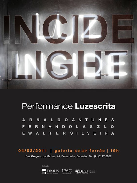O Happening Poético da exposição Luzescrita acontece hoje, às 19h na Galeria Solar Ferrão, no Pelourinho, com a participação dos poetas Arnaldo Antunes, Fernando Laszlo e Walter Silveira. Evento imperdível que tem o apoio da Secretaria de Cultura do Governo do Estado.