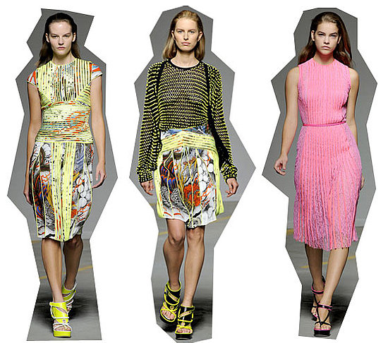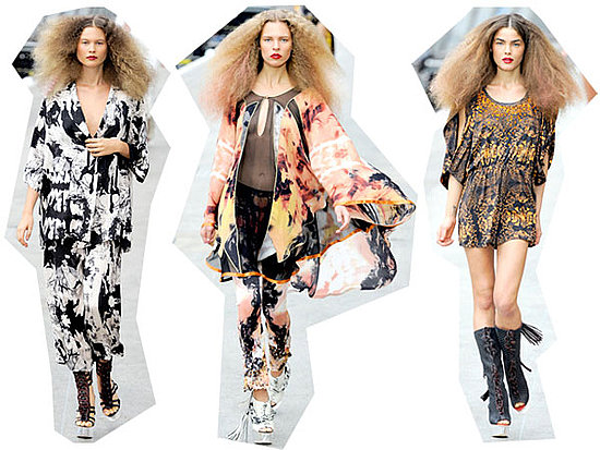 Da esquerda para a direita: Topshop Unique Silk Etchings Jacket($320) and Topshop Unique Silk Etchings Crop Pants($245), Topshop Unique Pink Smoke Smock Dress($400), Topshop Unique Gem Leaf Print Playsuit($450)